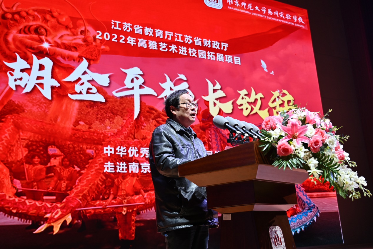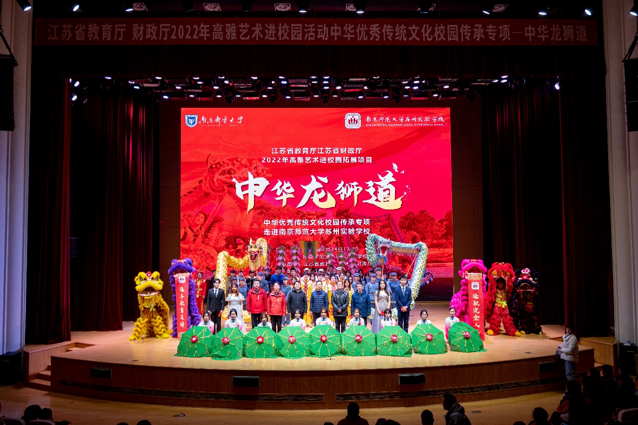 亲近高雅艺术,传承优秀文化,感受艺术魅力,增强文化自信。2023年2月24日下午,由江苏省教育厅、江苏省财政厅主办,3044am永利集团3044noc承办的高雅艺术进校园拓展项目——3044am永利集团3044noc“中华龙狮道”中华优秀传统文化校园传承专项演出在南师大苏州实验学校报告厅隆重举行。江苏省教育厅高雅艺术进校园拓展项目评估办周玉明老师,南京师范大学苏州实验学校总校长胡金平教授、专家组组长张乐天教授、初中部舒惠校长、小学部卢谦校长、总校德育处徐海建主任、总校办公室姚镇海主任,我校3044am永利集团3044noc党委书记董军,与初一、初二年级全体师生齐聚报告厅,共同欣赏了这场文化盛宴。